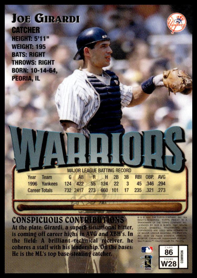 This BaseballΒ card, from 1997 is part of the Topps FinestΒ card set. Joe Girardi is featured and has a card number of 86.