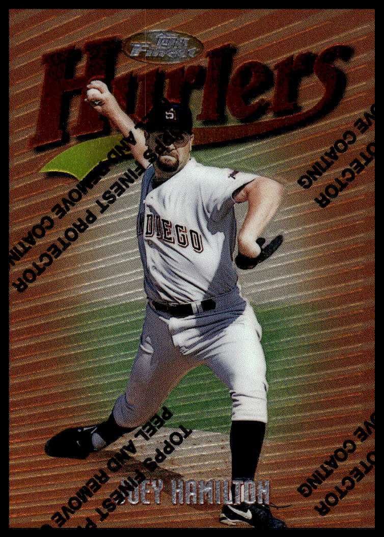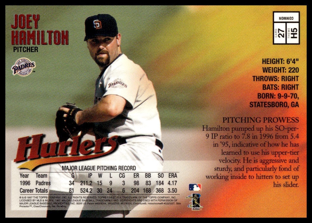 This BaseballΒ card, from 1997 is part of the Topps FinestΒ card set. Joey Hamilton is featured and has a card number of 27.
