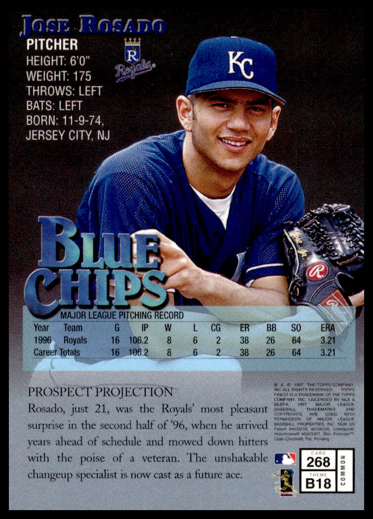 This BaseballΒ card, from 1997 is part of the Topps FinestΒ card set. Jose Rosado is featured and has a card number of 268.