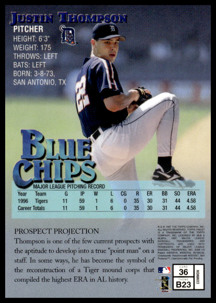 This BaseballΒ card, from 1997 is part of the Topps FinestΒ card set. Justin Thompson is featured and has a card number of 36.