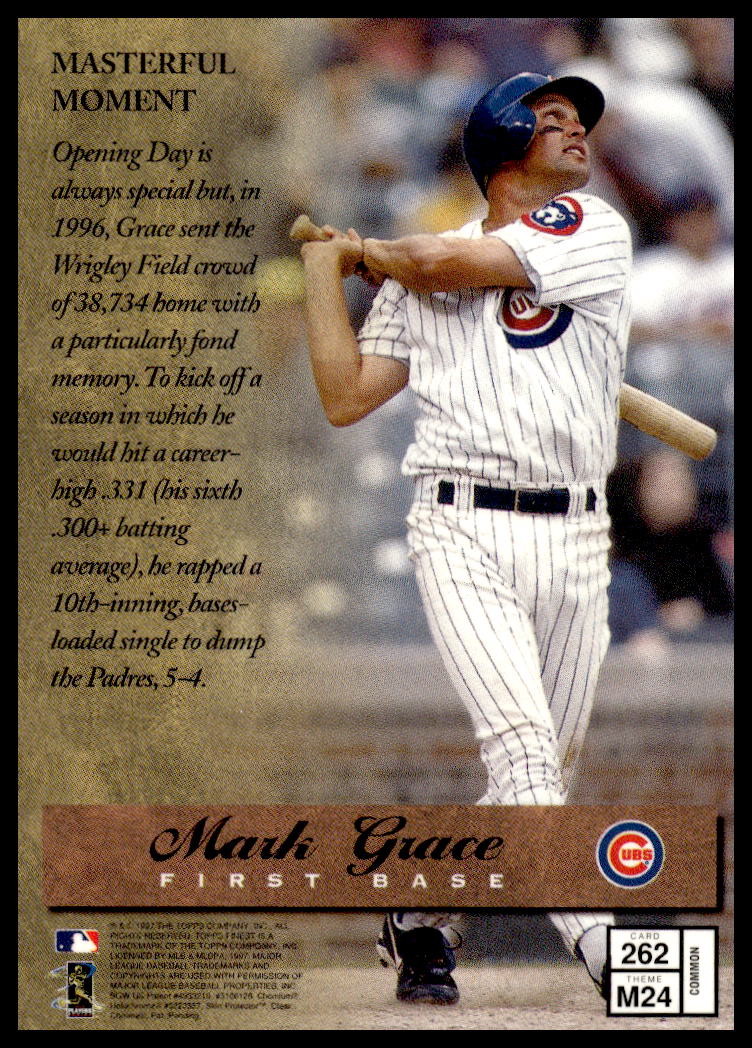 This Baseball card, from 1997 is part of the Topps Finest card set. Mark Grace is featured and has a card number of 262.