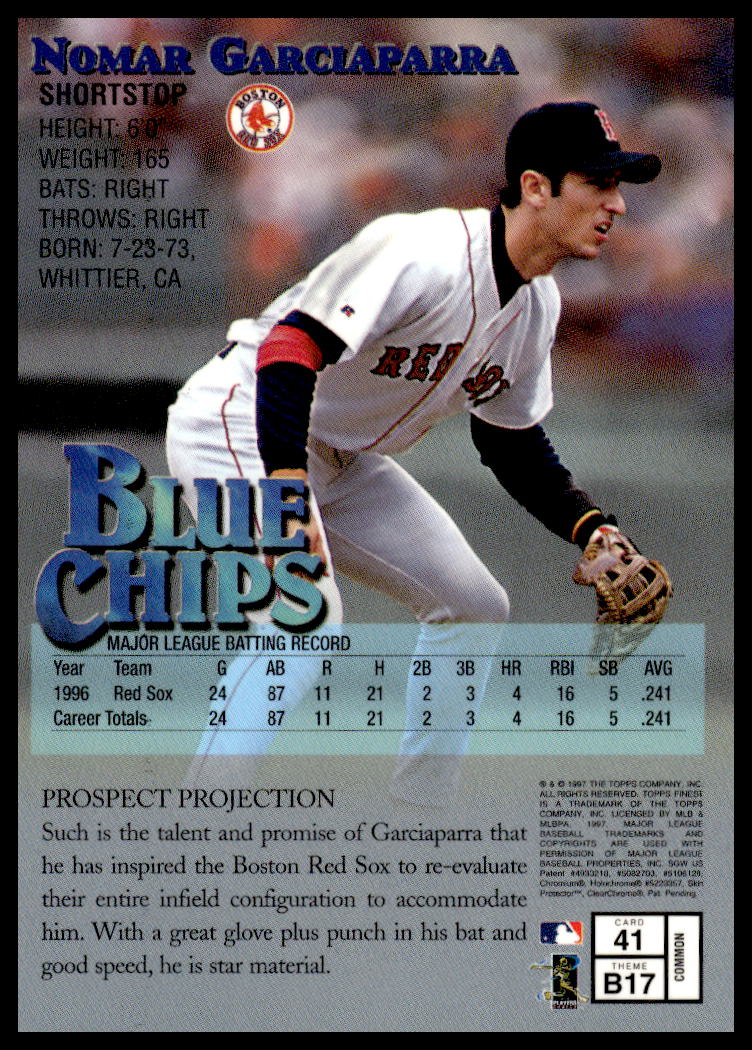 This BaseballΒ card, from 1997 is part of the Topps FinestΒ card set. Nomar Garciaparra is featured and has a card number of 41.