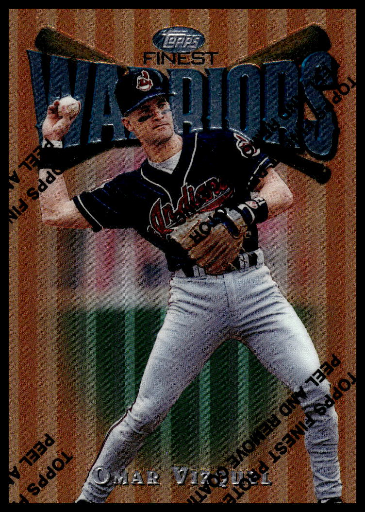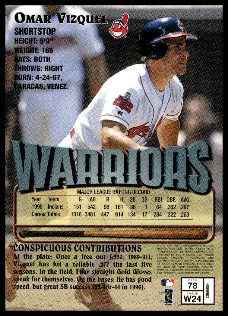 This BaseballΒ card, from 1997 is part of the Topps FinestΒ card set. Omar Vizquel is featured and has a card number of 78.