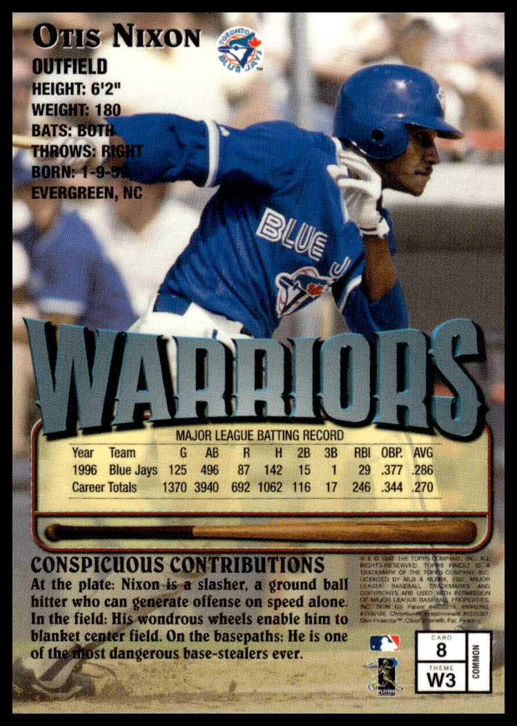 This Baseball card, from 1997 is part of the Topps Finest card set. Otis Nixon is featured and has a card number of 8.