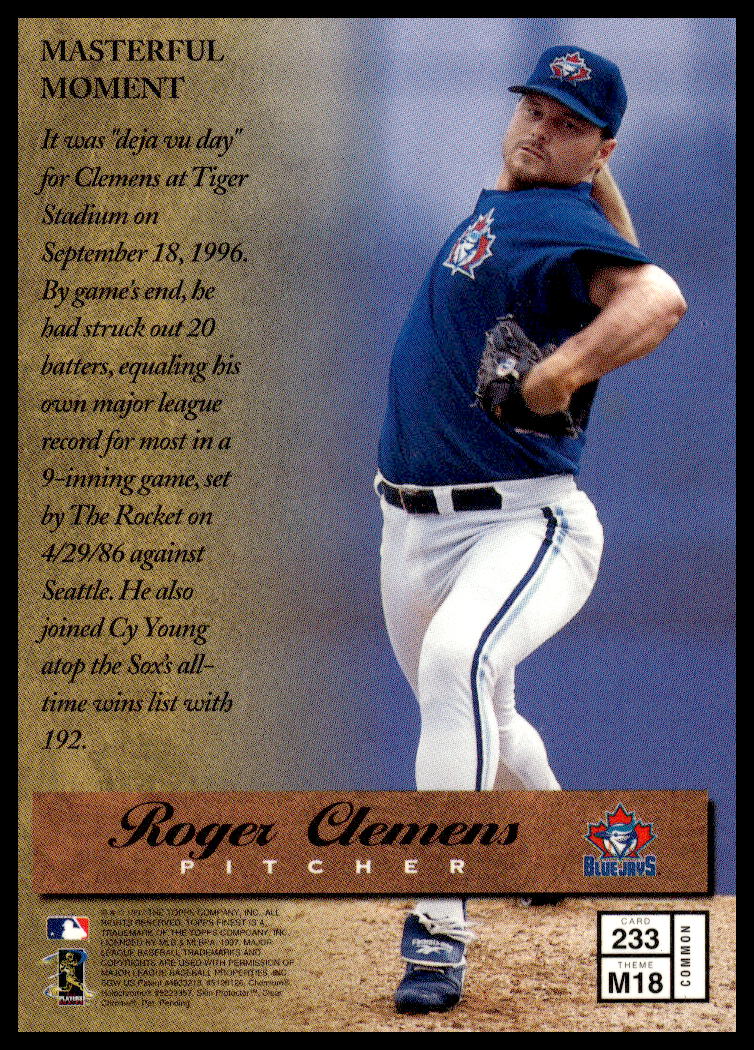 This BaseballΒ card, from 1997 is part of the Topps FinestΒ card set. Roger Clemens is featured and has a card number of 233.