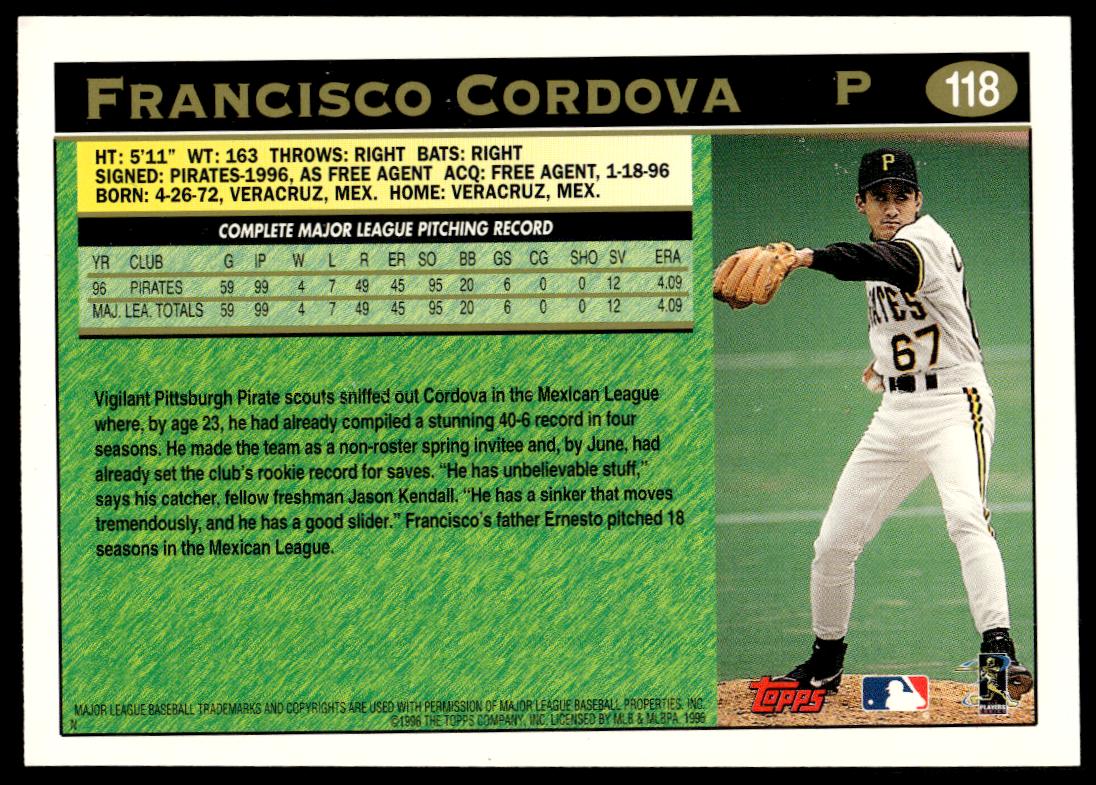 This BaseballΒ card, from 1997 is part of the Topps Series 1Β card set. Francisco Cordova is featured and has a card number of 118.