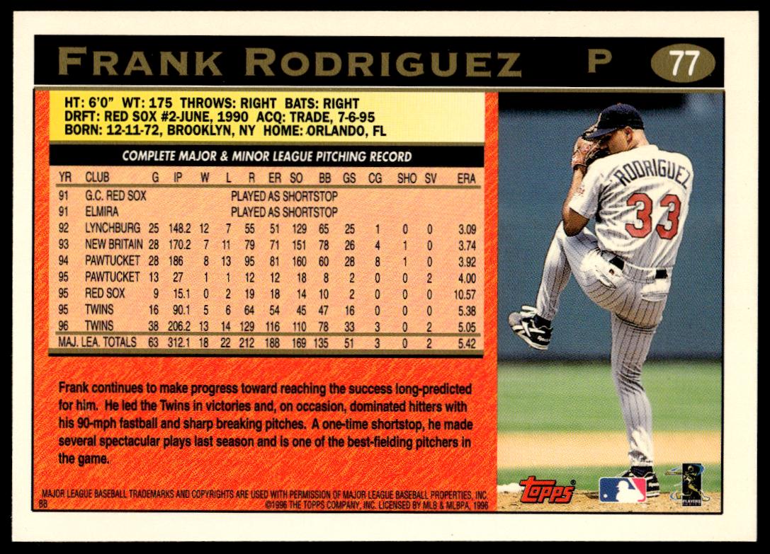 This Baseball card, from 1997 is part of the Topps Series 1 card set. Frank Rodriguez is featured and has a card number of 77.