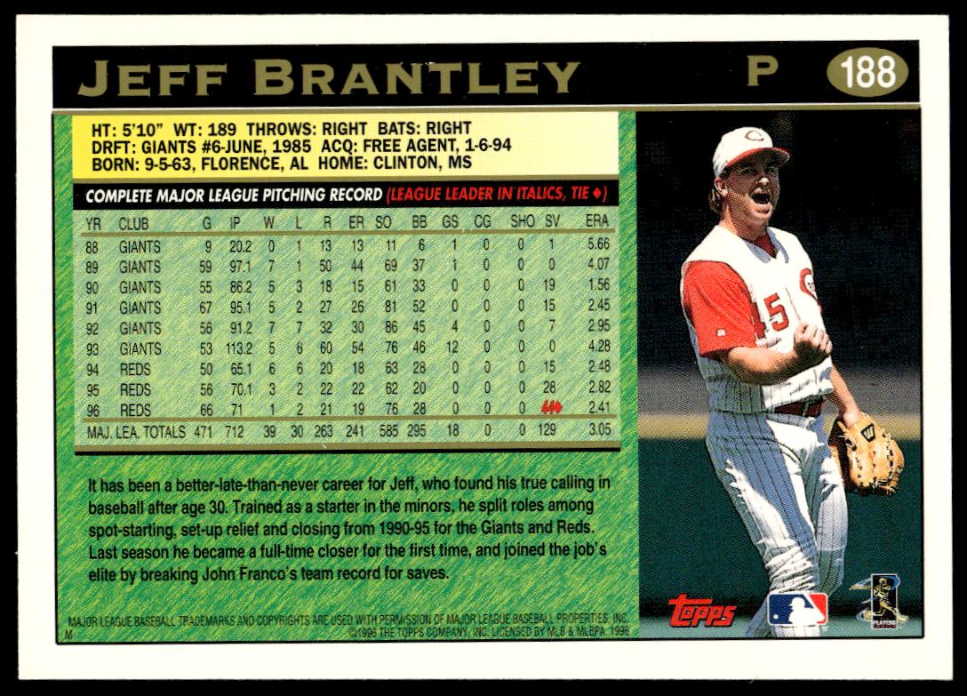 This BaseballΒ card, from 1997 is part of the Topps Series 1Β card set. Jeff Brantley is featured and has a card number of 188.