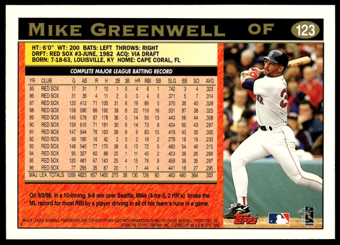 This BaseballΒ card, from 1997 is part of the Topps Series 1Β card set. Mike Greenwell is featured and has a card number of 123.