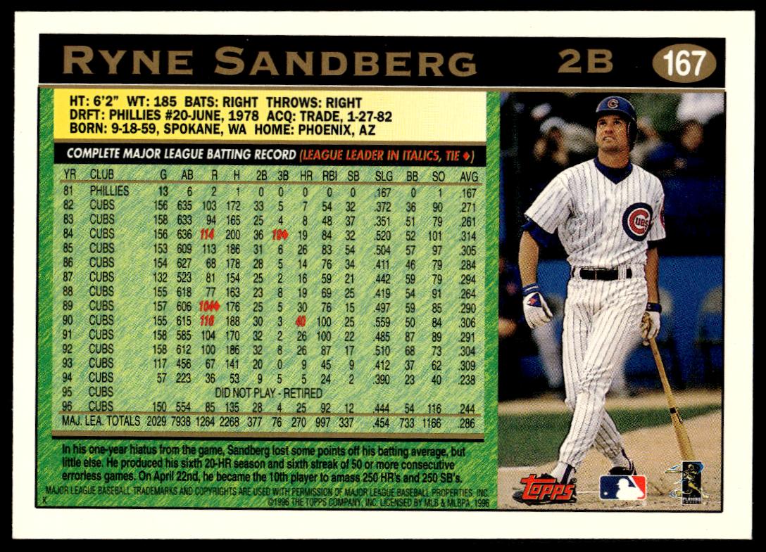 This Baseball card, from 1997 is part of the Topps Series 1 card set. Ryne Sandberg is featured and has a card number of 167.
