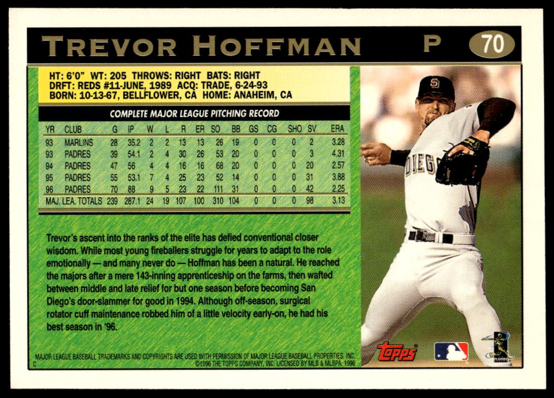 This BaseballΒ card, from 1997 is part of the Topps Series 1Β card set. Trevor Hoffman is featured and has a card number of 70.