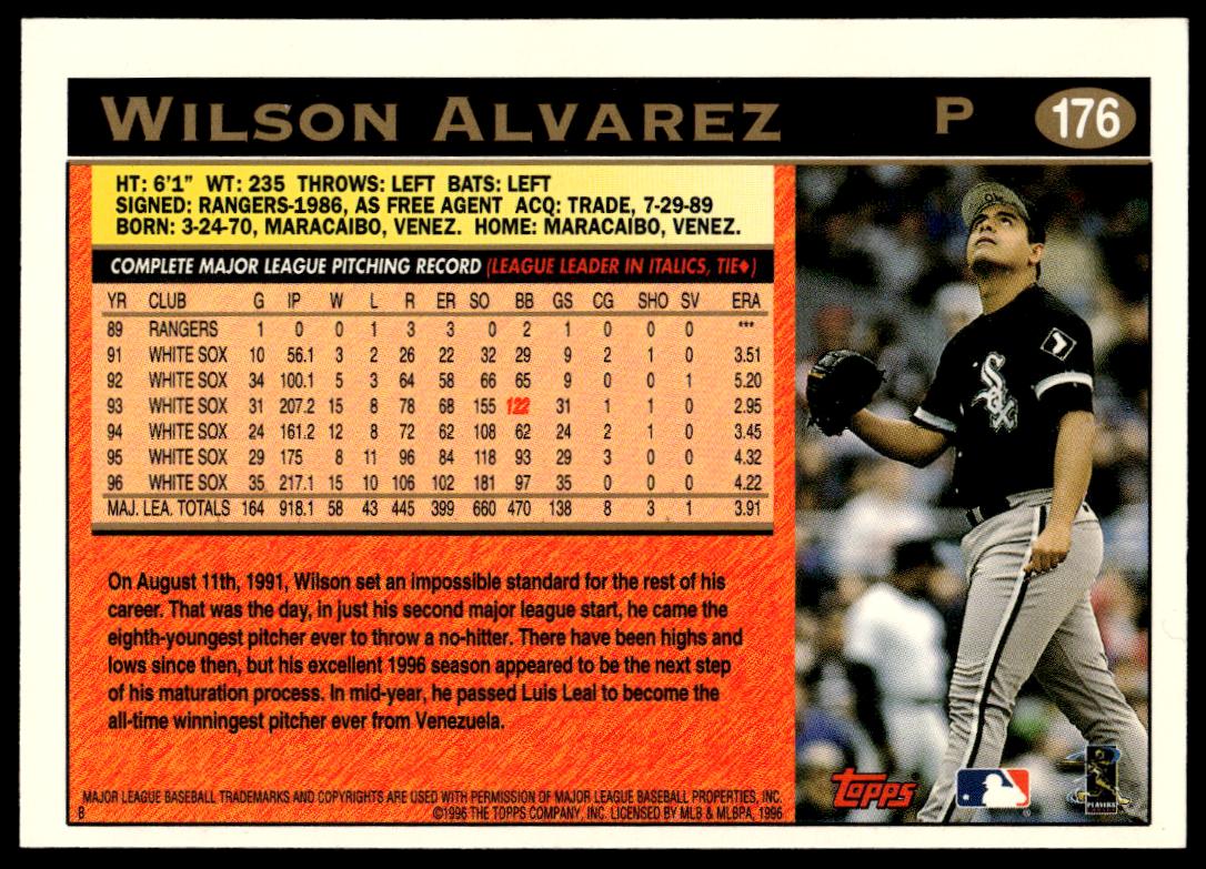 This Baseball card, from 1997 is part of the Topps Series 1 card set. Wilson Alvarez is featured and has a card number of 176.