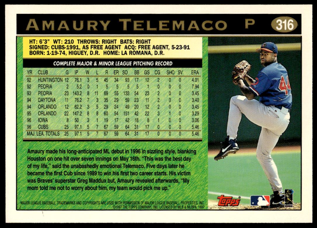 This BaseballΒ card, from 1997 is part of the Topps Series 2Β card set. Amaury Telemaco is featured and has a card number of 316.