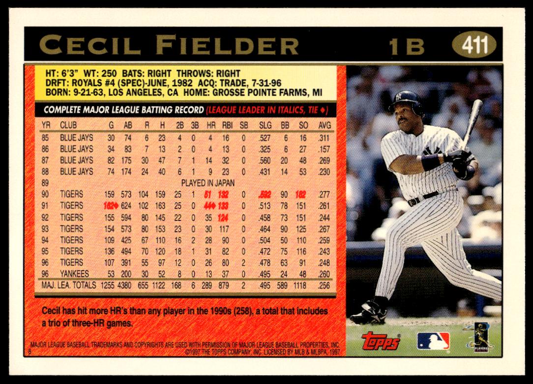 This BaseballΒ card, from 1997 is part of the Topps Series 2Β card set. Cecil Fielder is featured and has a card number of 411.