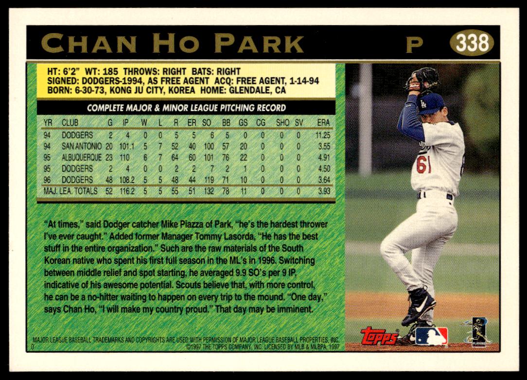 This BaseballΒ card, from 1997 is part of the Topps Series 2Β card set. Chan Ho Park is featured and has a card number of 338.