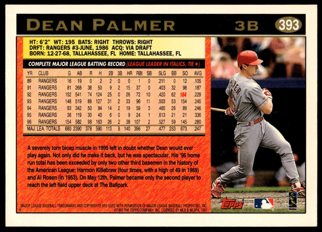 This BaseballΒ card, from 1997 is part of the Topps Series 2Β card set. Dean Palmer is featured and has a card number of 393.