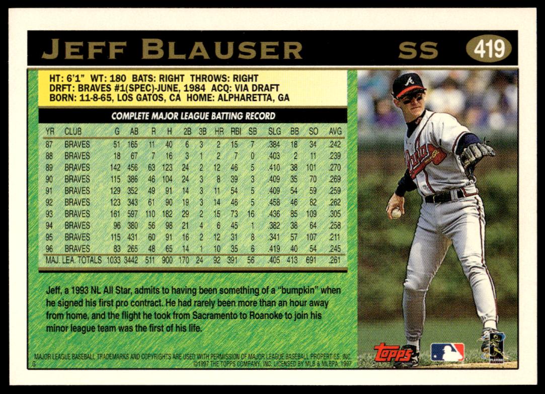 This BaseballΒ card, from 1997 is part of the Topps Series 2Β card set. Jeff Blauser is featured and has a card number of 419.