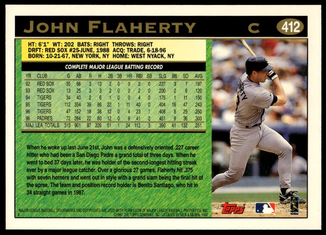 This BaseballΒ card, from 1997 is part of the Topps Series 2Β card set. John Flaherty is featured and has a card number of 412.