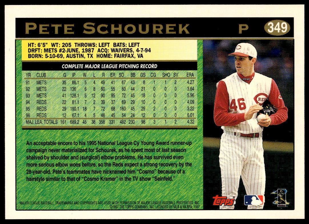 This BaseballΒ card, from 1997 is part of the Topps Series 2Β card set. Pete Schourek is featured and has a card number of 349.