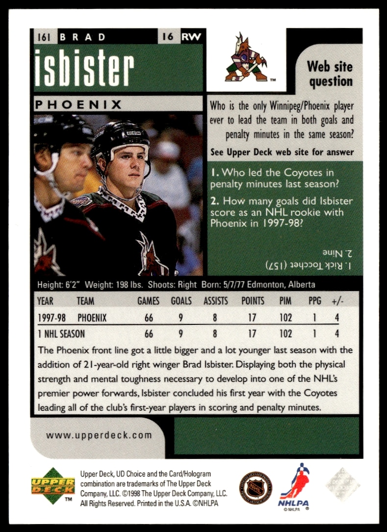 This Hockey card, from 1998-99 is part of the Upper Deck UD Choice Preview card set. Brad Isbister is featured and has a card number of 161.