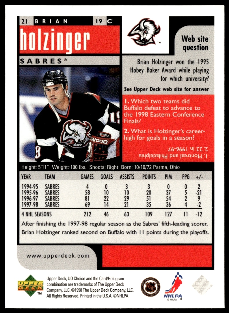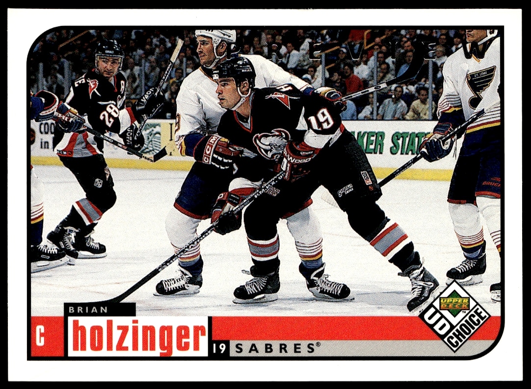This Hockey card, from 1998-99 is part of the Upper Deck UD Choice Preview card set. Brian Holzinger is featured and has a card number of 21.