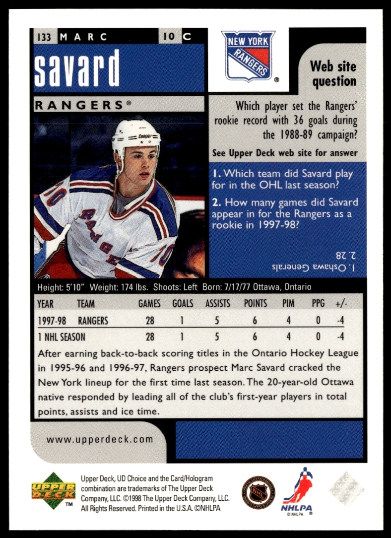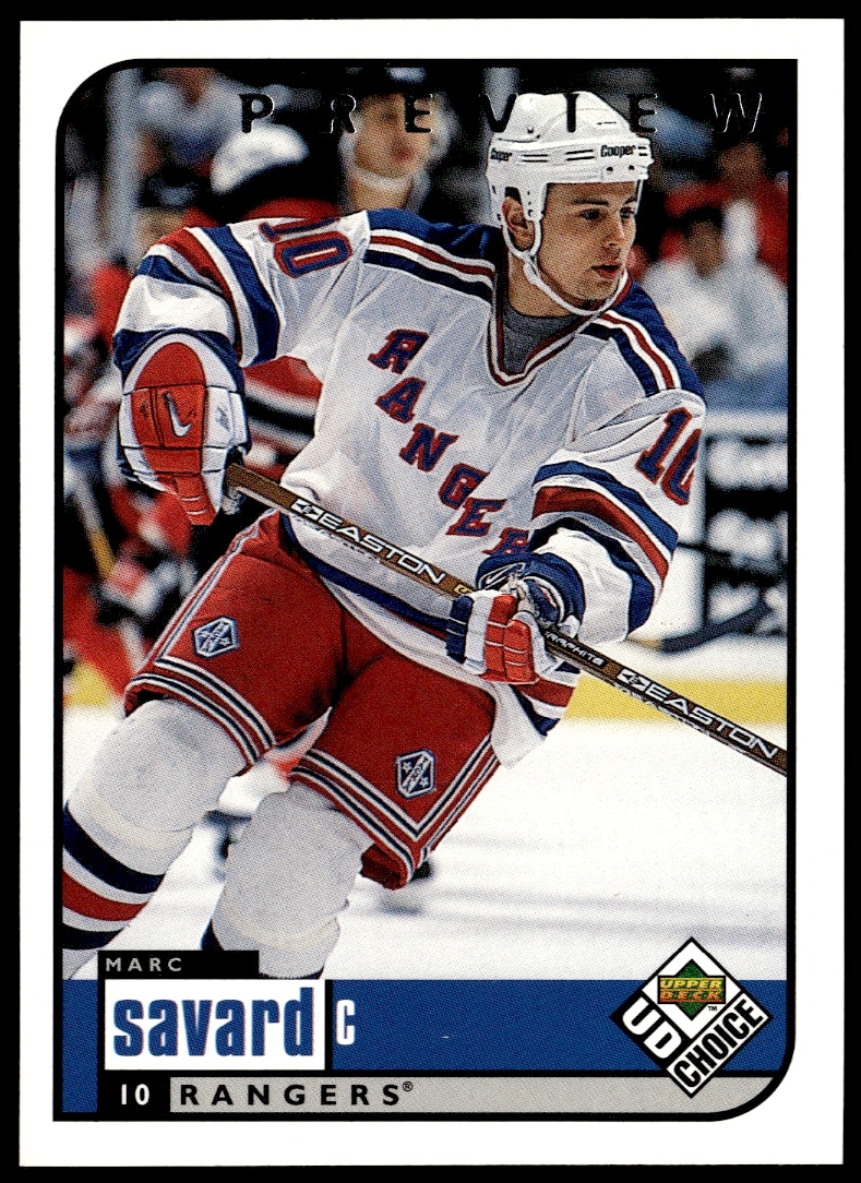 This Hockey card, from 1998-99 is part of the Upper Deck UD Choice Preview card set. Marc Savard is featured and has a card number of 133.