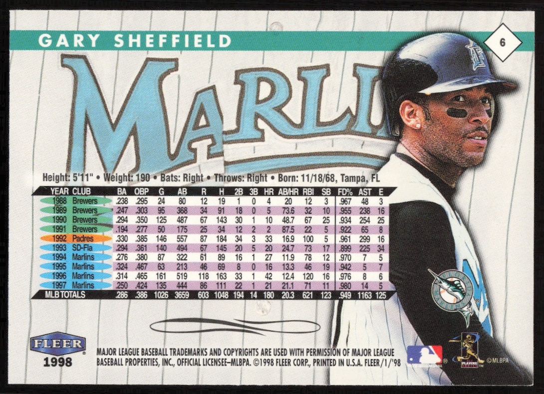 This Baseball card, from 1998 is part of the Fleer Tradition card set. Gary Sheffield is featured and has a card number of 6.