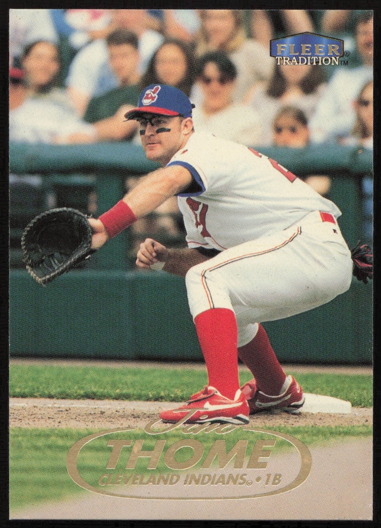 This Baseball card, from 1998 is part of the Fleer Tradition card set. Jim Thome is featured and has a card number of 110.