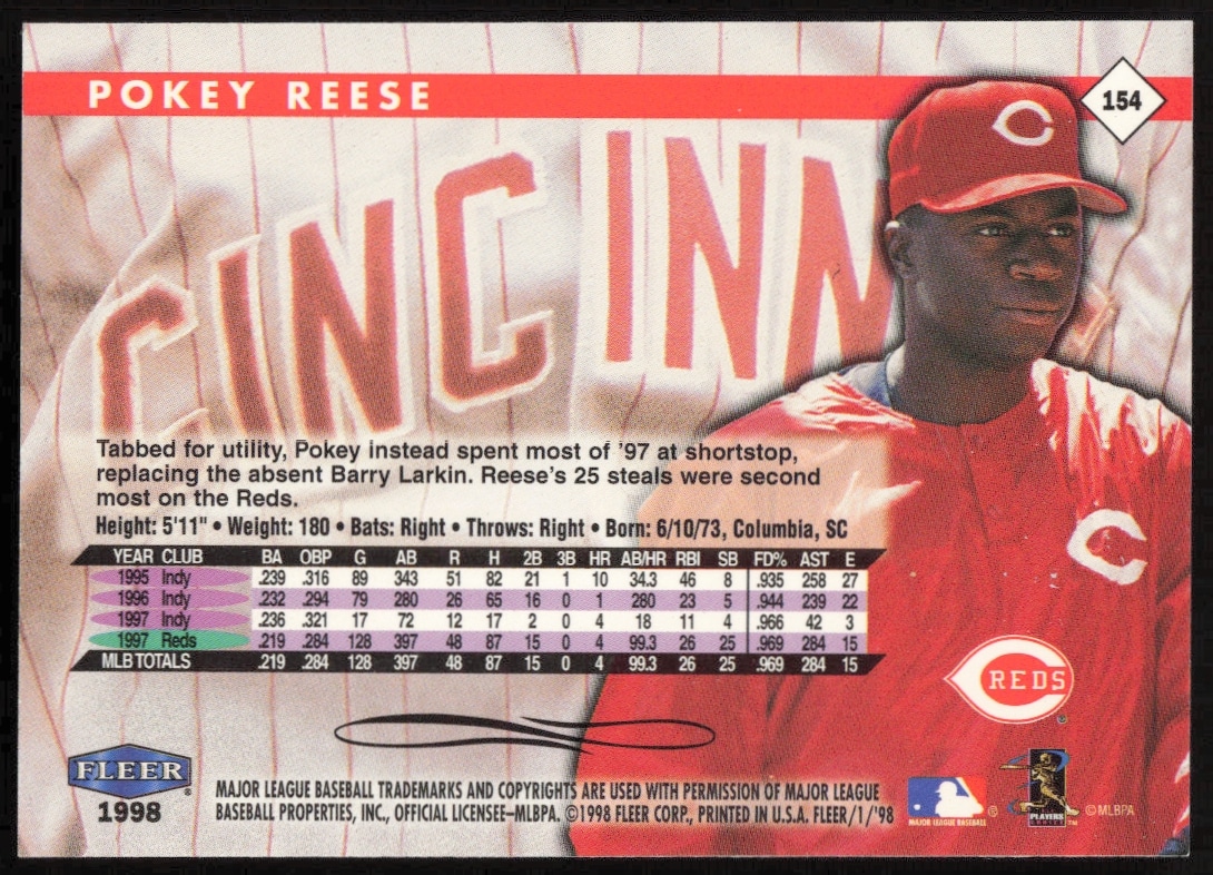 This Baseball card, from 1998 is part of the Fleer Tradition card set. Pokey Reese is featured and has a card number of 154.