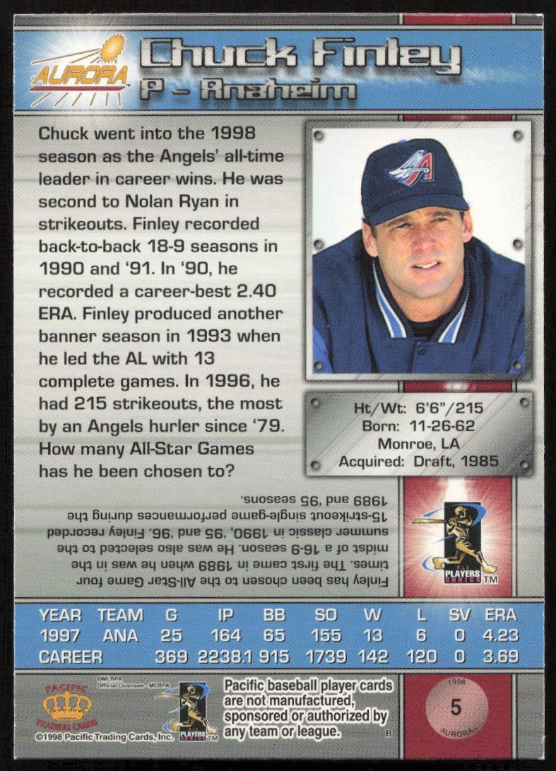 This Baseball card, from 1998 is part of the Pacific Aurora card set. Chuck Finley is featured and has a card number of 5.