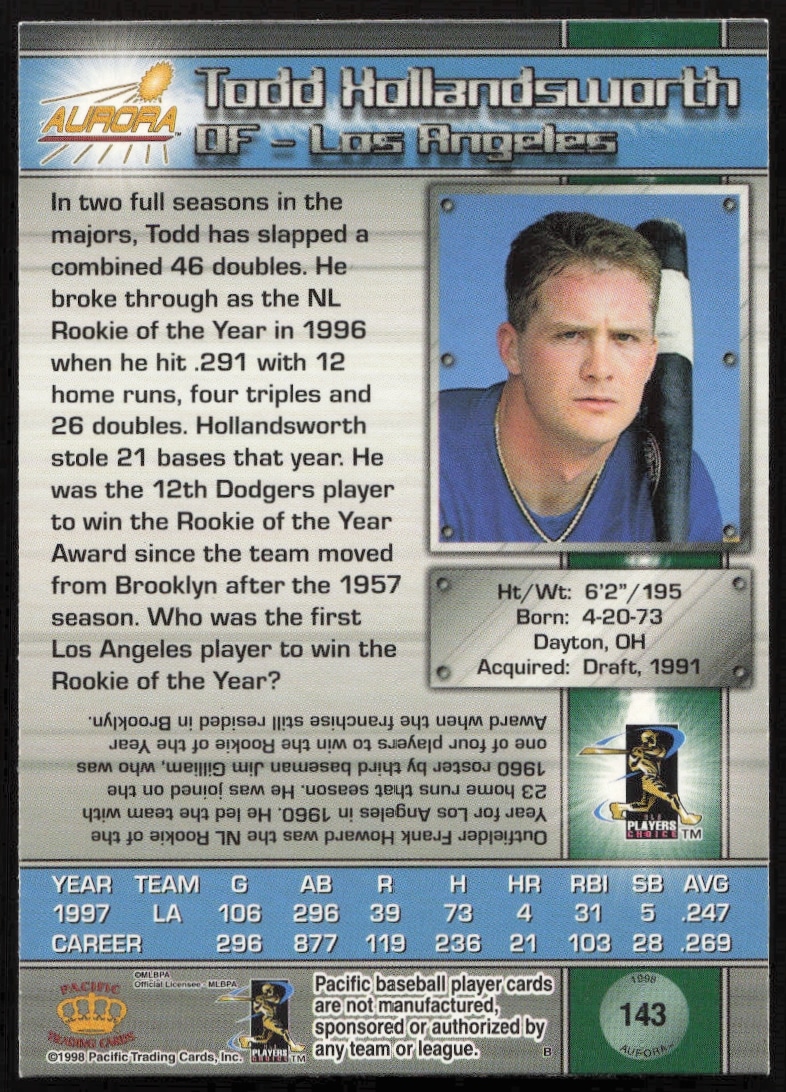This Baseball card, from 1998 is part of the Pacific Aurora card set. Todd Hollandsworth is featured and has a card number of 143.