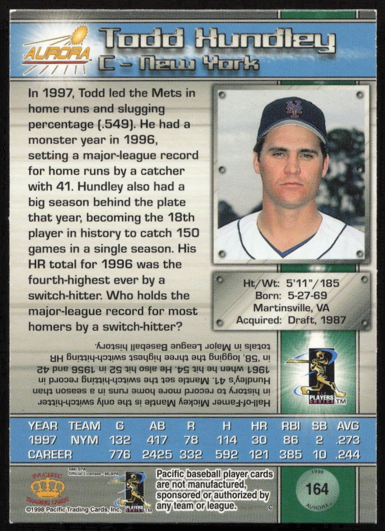 This Baseball card, from 1998 is part of the Pacific Aurora card set. Todd Hundley is featured and has a card number of 164.