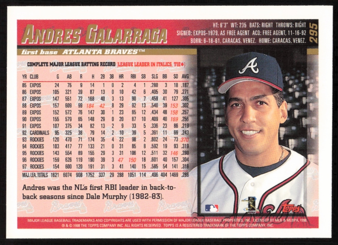 This Baseball card, from 1998 is part of the Topps card set. Andres Galarraga is featured and has a card number of 295.