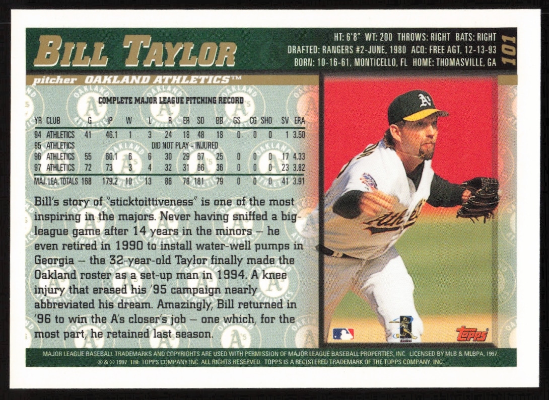 This Baseball card, from 1998 is part of the Topps card set. Bill Taylor is featured and has a card number of 101.