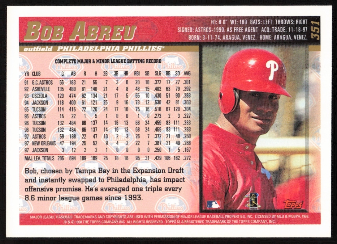This Baseball card, from 1998 is part of the Topps card set. Bob Abreu is featured and has a card number of 351.