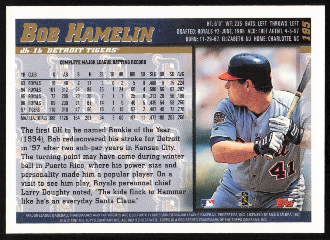 This Baseball card, from 1998 is part of the Topps card set. Bob Hamelin is featured and has a card number of 195.