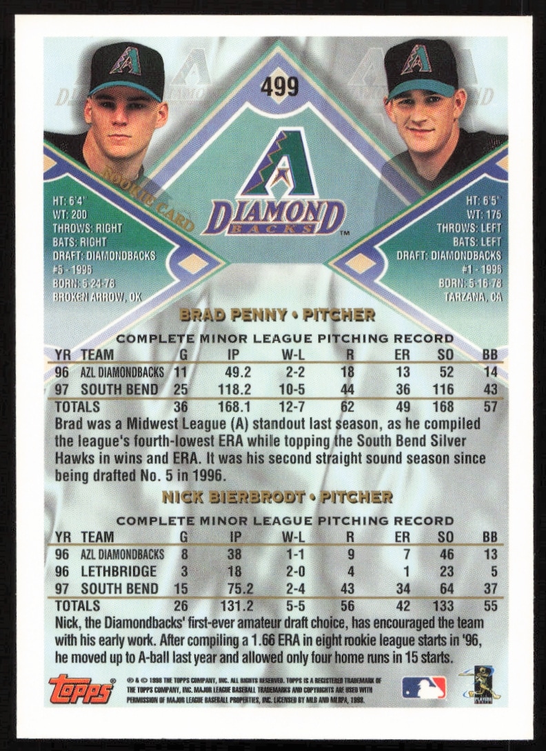 This Baseball card, from 1998 is part of the Topps card set. Brad Penny / Nick Bierbrodt is featured and has a card number of 499.