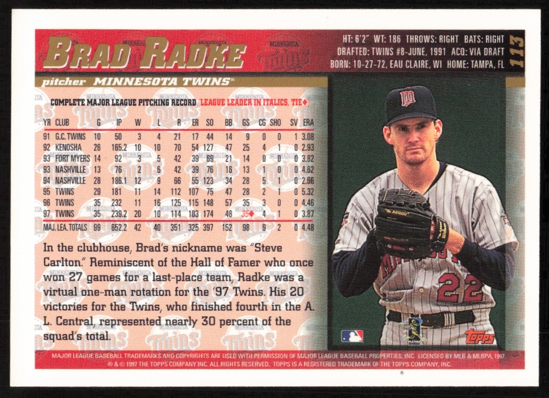 This Baseball card, from 1998 is part of the Topps card set. Brad Radke is featured and has a card number of 113.