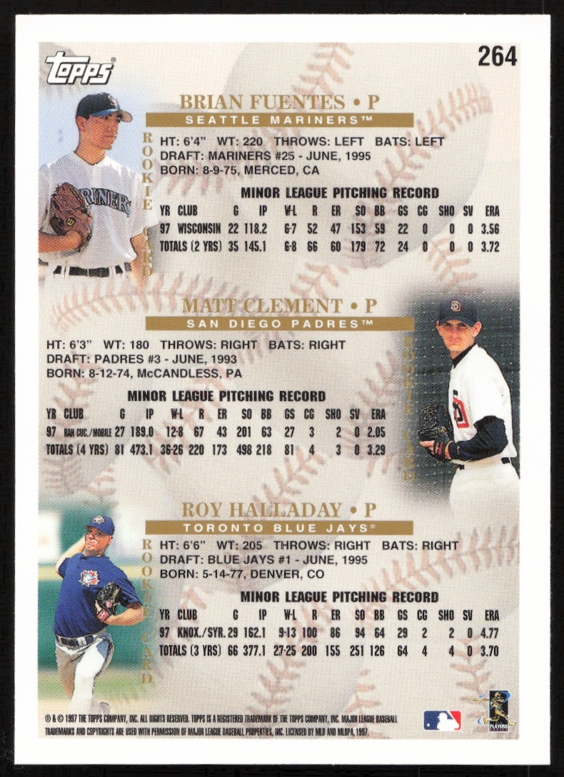 This Baseball card, from 1998 is part of the Topps card set. Brian Fuentes / Matt Clement / Roy Halladay is featured and has a card number of 264.