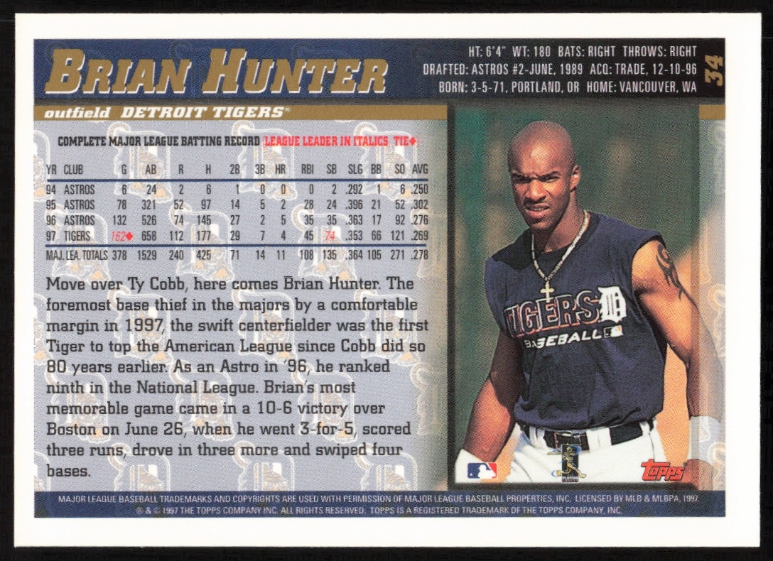 This Baseball card, from 1998 is part of the Topps card set. Brian Hunter is featured and has a card number of 34.