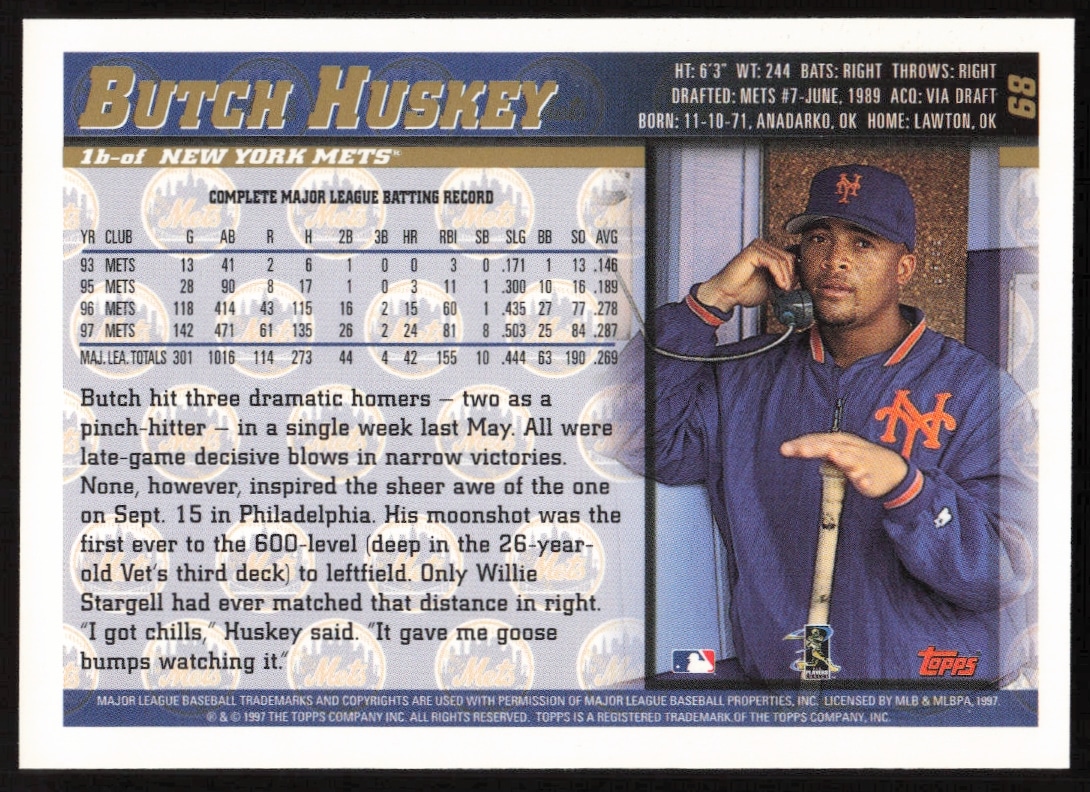 This Baseball card, from 1998 is part of the Topps card set. Butch Huskey is featured and has a card number of 68.