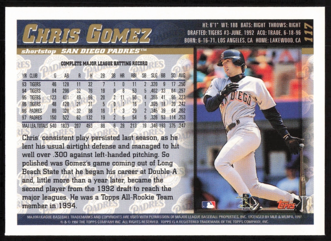 This Baseball card, from 1998 is part of the Topps card set. Chris Gomez is featured and has a card number of 117.