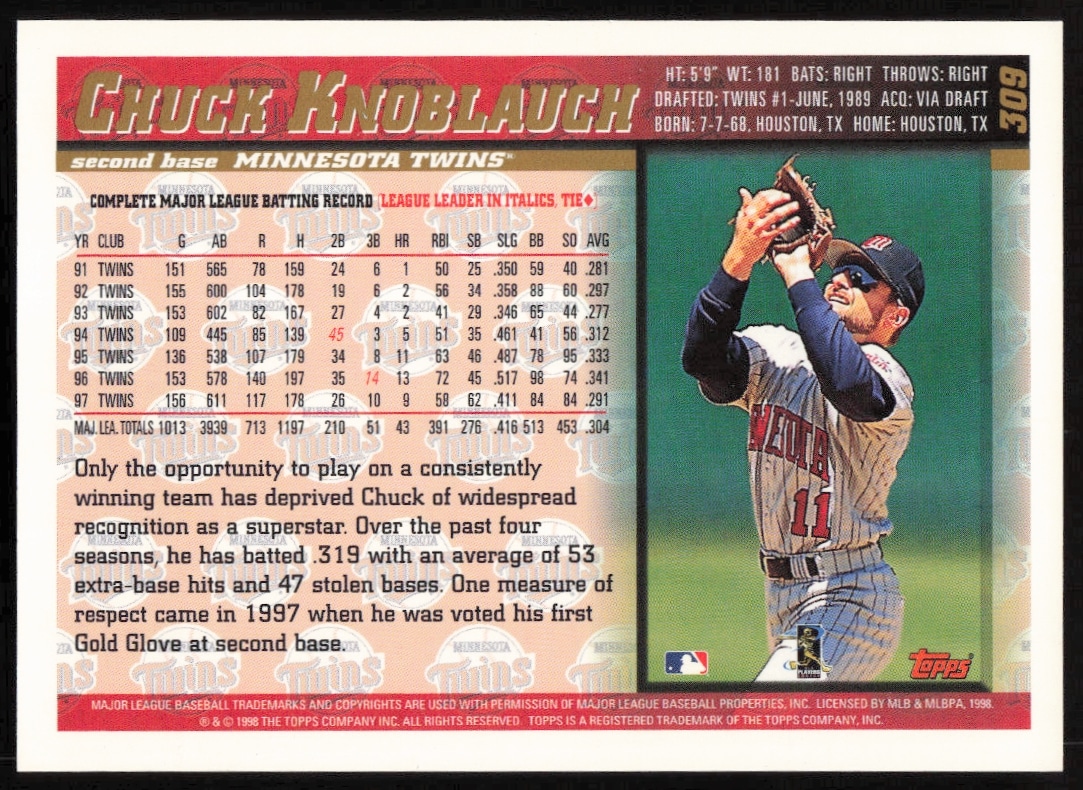 This Baseball card, from 1998 is part of the Topps card set. Chuck Knoblauch is featured and has a card number of 309.
