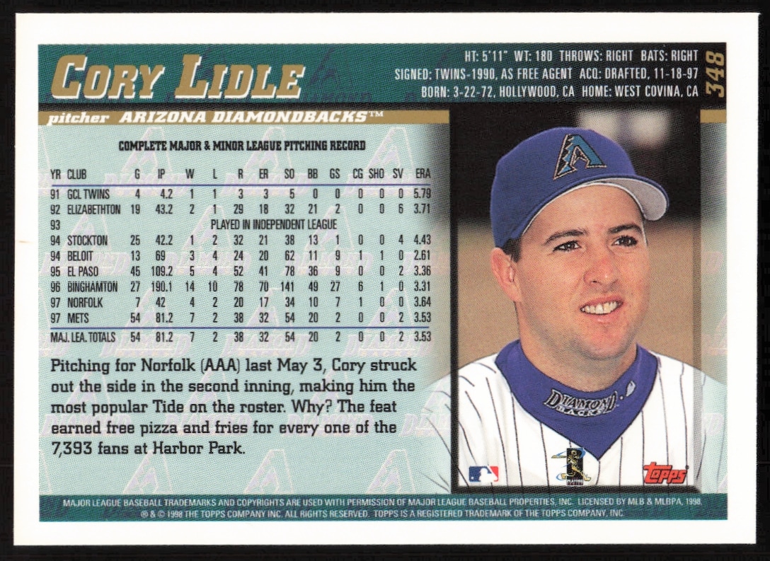 This Baseball card, from 1998 is part of the Topps card set. Cory Lidle is featured and has a card number of 348.