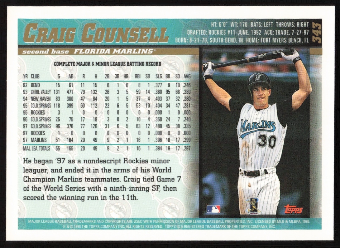 This Baseball card, from 1998 is part of the Topps card set. Craig Counsell is featured and has a card number of 343.