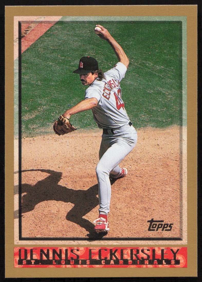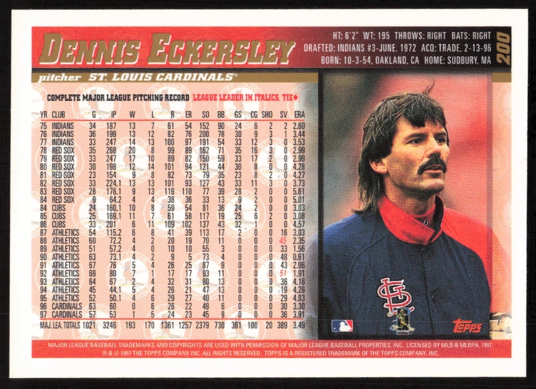 This Baseball card, from 1998 is part of the Topps card set. Dennis Eckersley is featured and has a card number of 200.