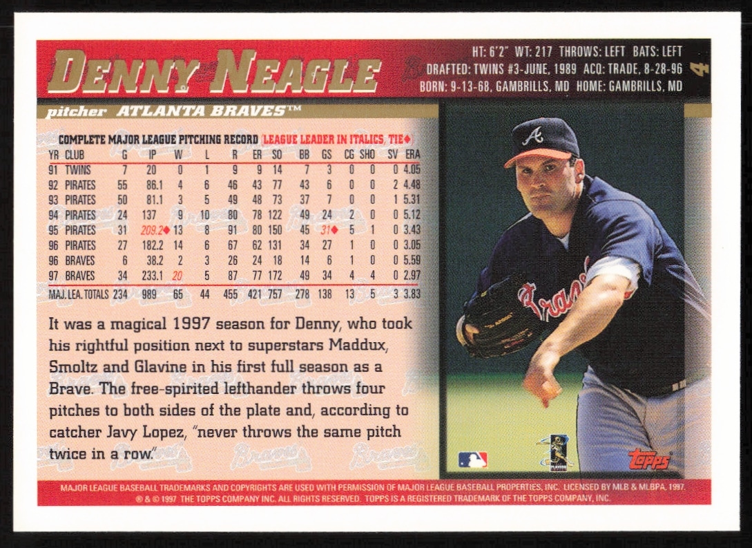 This Baseball card, from 1998 is part of the Topps card set. Denny Neagle is featured and has a card number of 4.