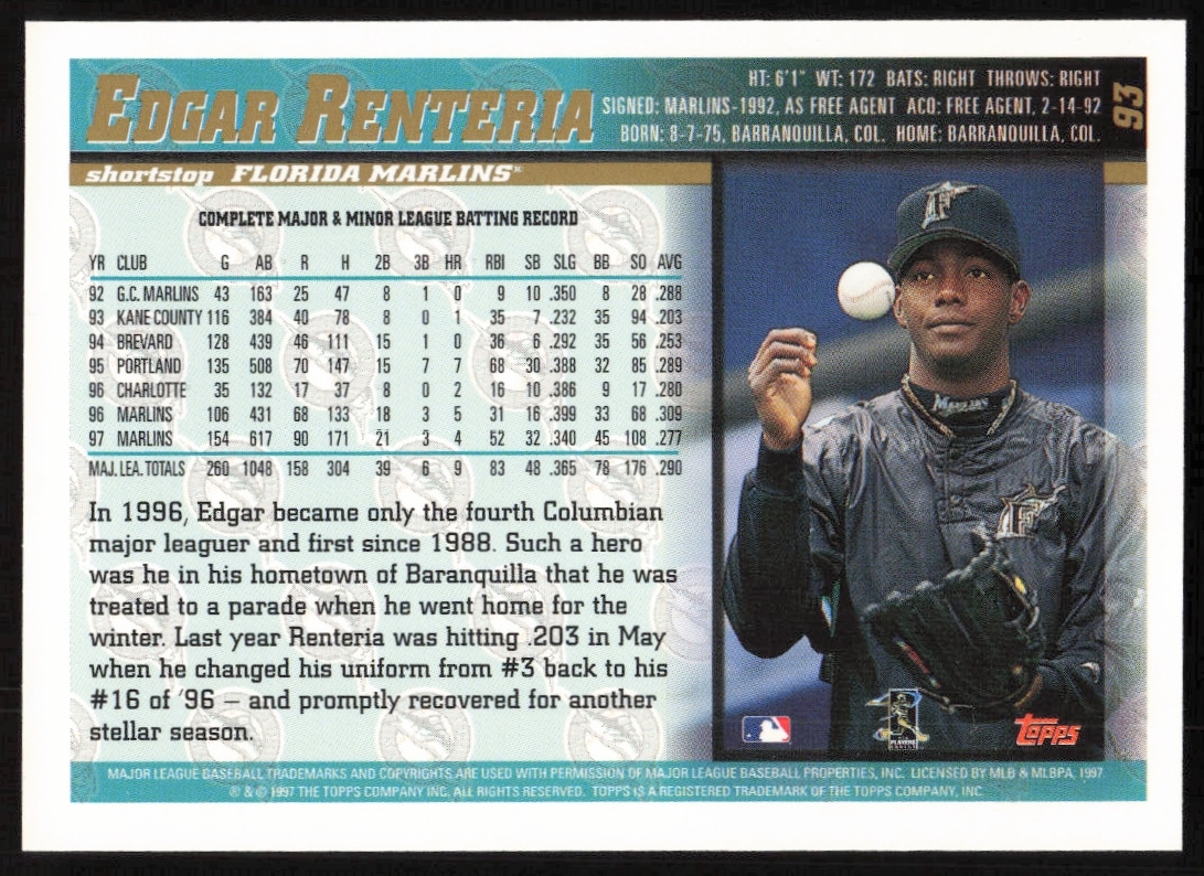 This Baseball card, from 1998 is part of the Topps card set. Edgar Renteria is featured and has a card number of 93.