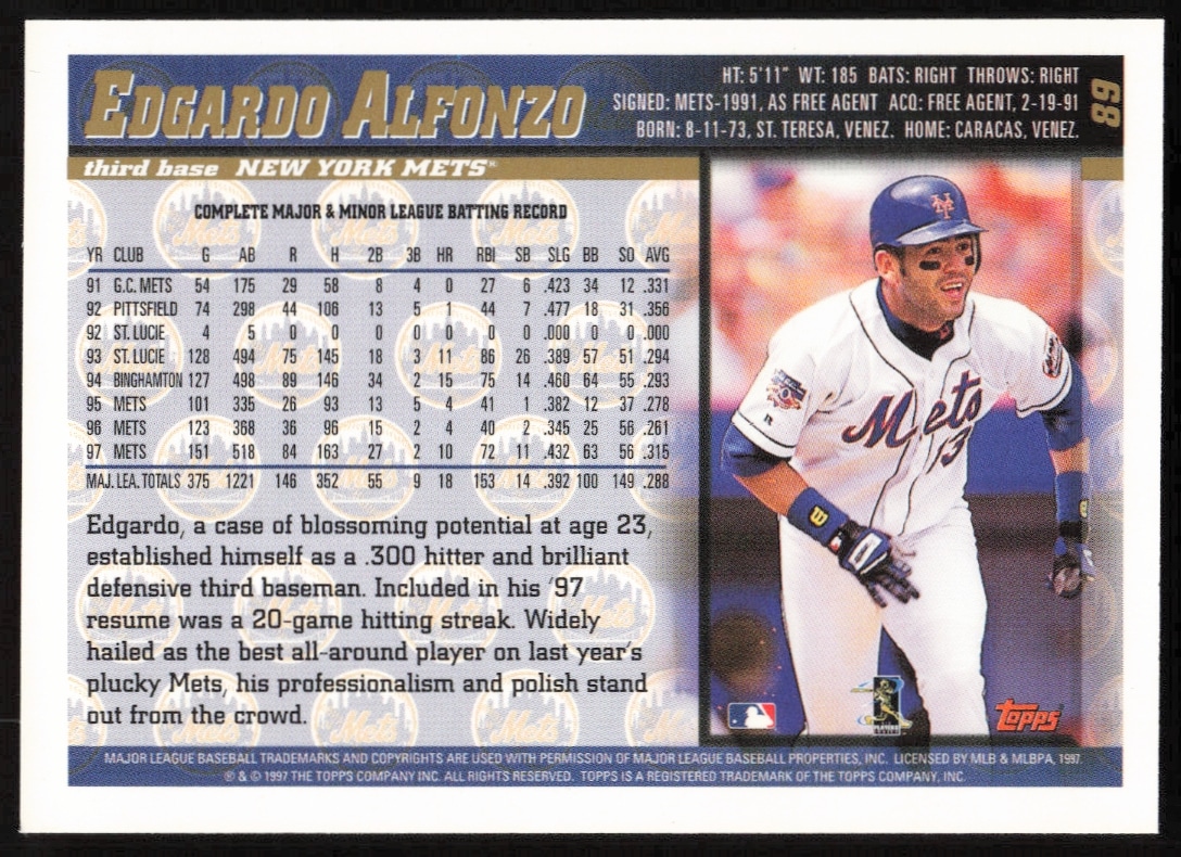 This Baseball card, from 1998 is part of the Topps card set. Edgardo Alfonzo is featured and has a card number of 89.