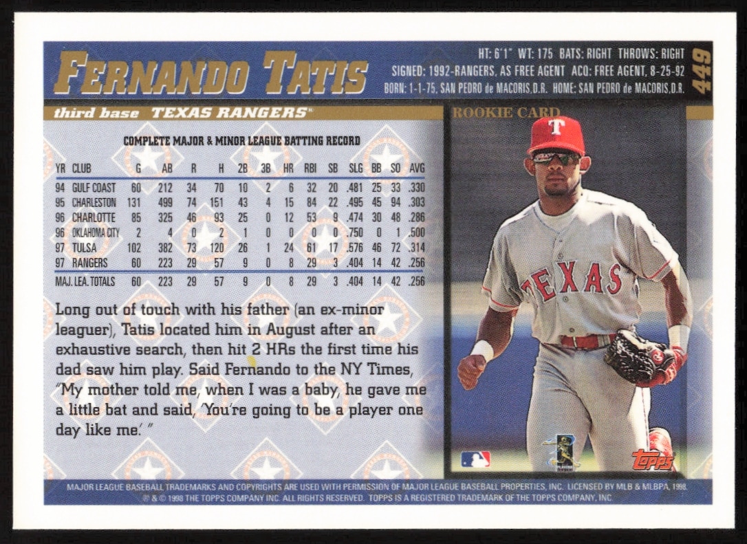 This Baseball card, from 1998 is part of the Topps card set. Fernando Tatis is featured and has a card number of 449.